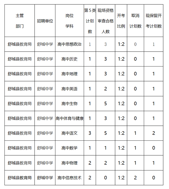 1、舒城中学引进高层次和紧缺人才第5类人员岗位计划数调整表