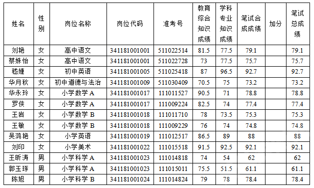 根据《关于2023年度天长市中小学新任教师公开招聘现场资格复审的通知》精神,截止到4月18日下午5:30,共有16名同志未按时参加资格复审,由此出现人选缺额,根据公告要求按笔试总成绩从高分到低分依次等额递补(递补人员最后一名如有多位报考人员成绩相同,并列进入)。高中语文递补2人,初中英语递补1人,初中道德与法治递补1人,小学数学A递补2人(其中1人为二次递补),小学数学B递补2人,小学英语递补1人,小学美术递补1人,小学科学A递补2人,小学科学B递补1人,初中物理和小学道德与法治无人递补。现将递补人员信息公示如下: